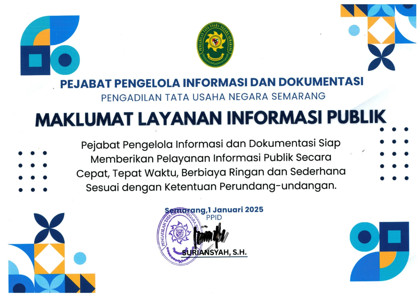 Dalam melaksanakan kegiatan pelayanan publik, Pengadilan Tata Usaha Negara Semarang berupaya untuk selalu dapat memenuhi harapan masyarakat, khususnya para pencari keadilan. Bila terdapat informasi yang tidak terdapat di situs pengadilan, masyarakat dapat mengajuan permohonan informasi ke Pengadilan Tata Usaha Negara Semarang dengan klik link berikut ini